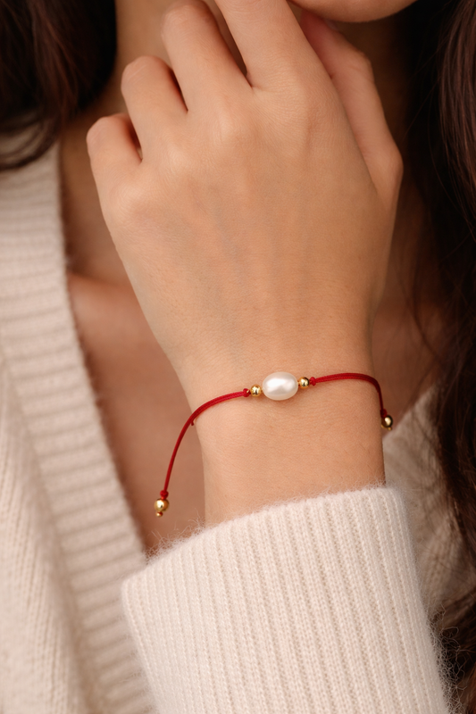 Pulsera de hilo rojo con Perla 1cm y 4 esferas bimetal 3mm