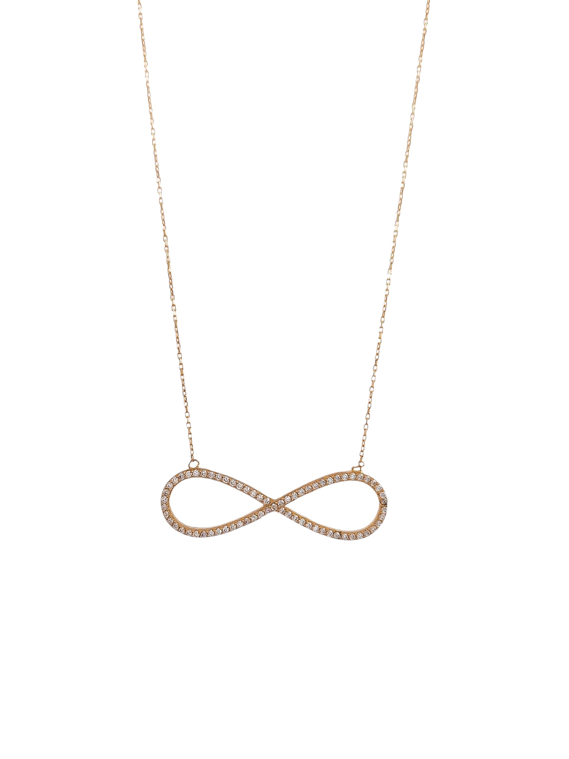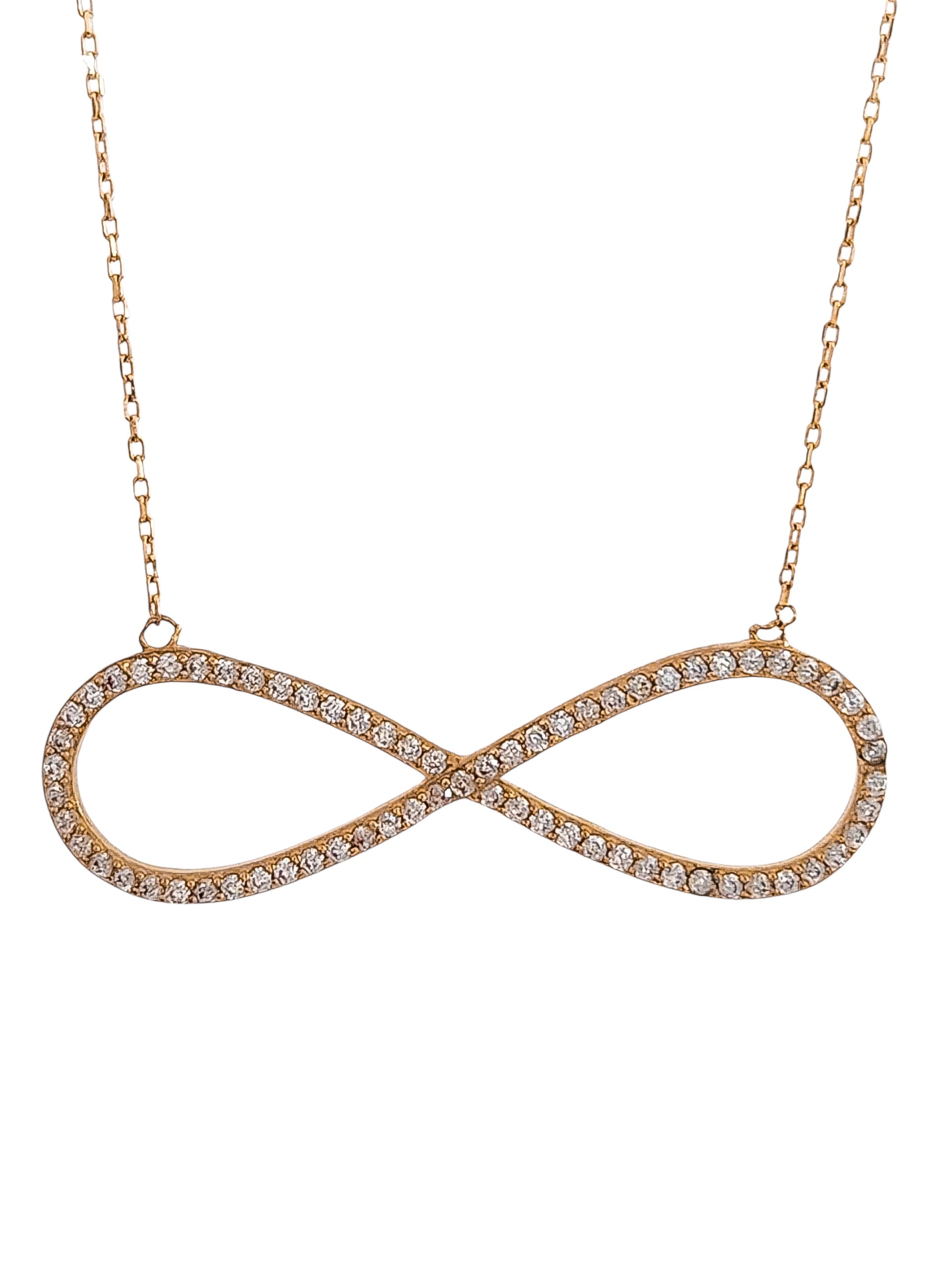 Exhiba una mirada de elegancia con nuestra Gargantilla infinito grande con zirconias de oro 10k. Con un infinito de 4 cm adornado con piedras blancas zirconias, esta gargantilla es el complemento perfecto para una apariencia sofisticada. Aprovecha el brillo y la durabilidad del oro para realzar tu estilo.